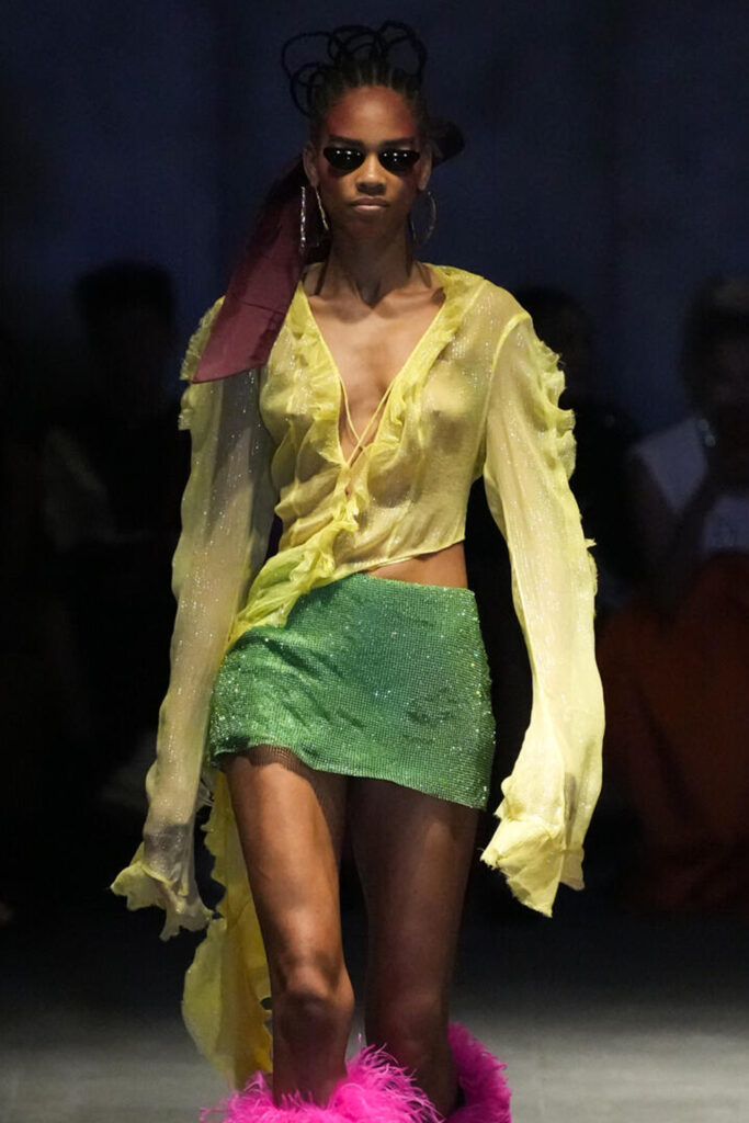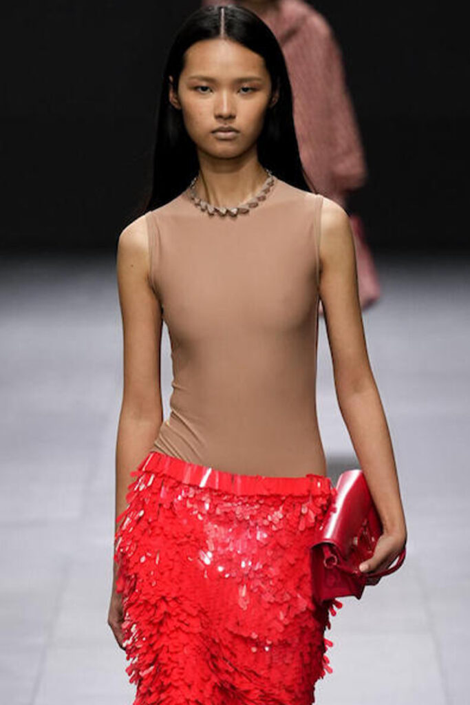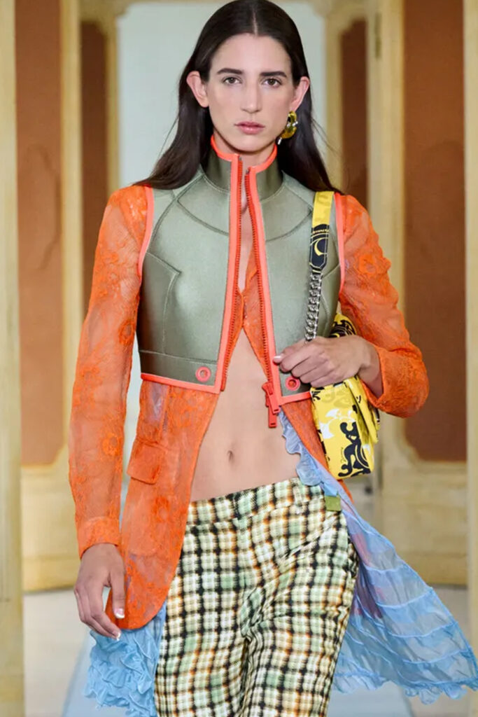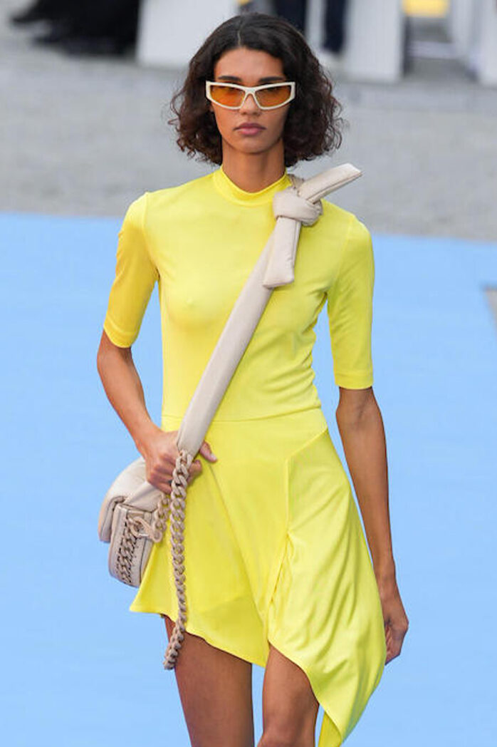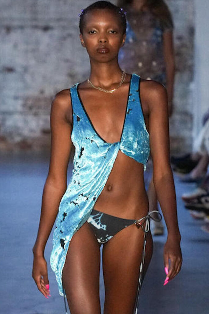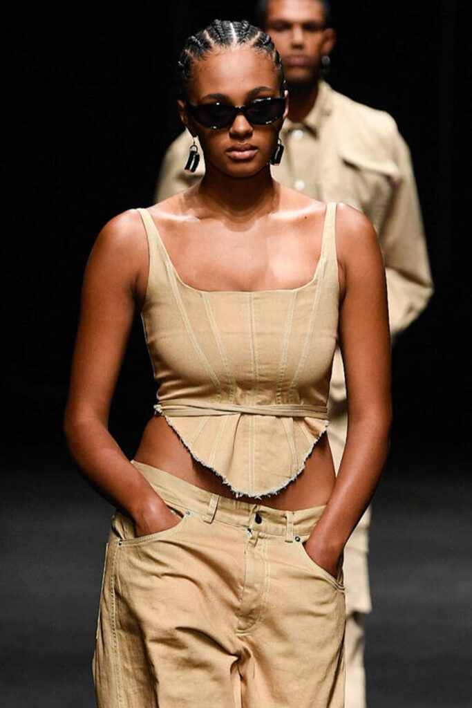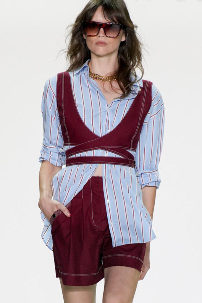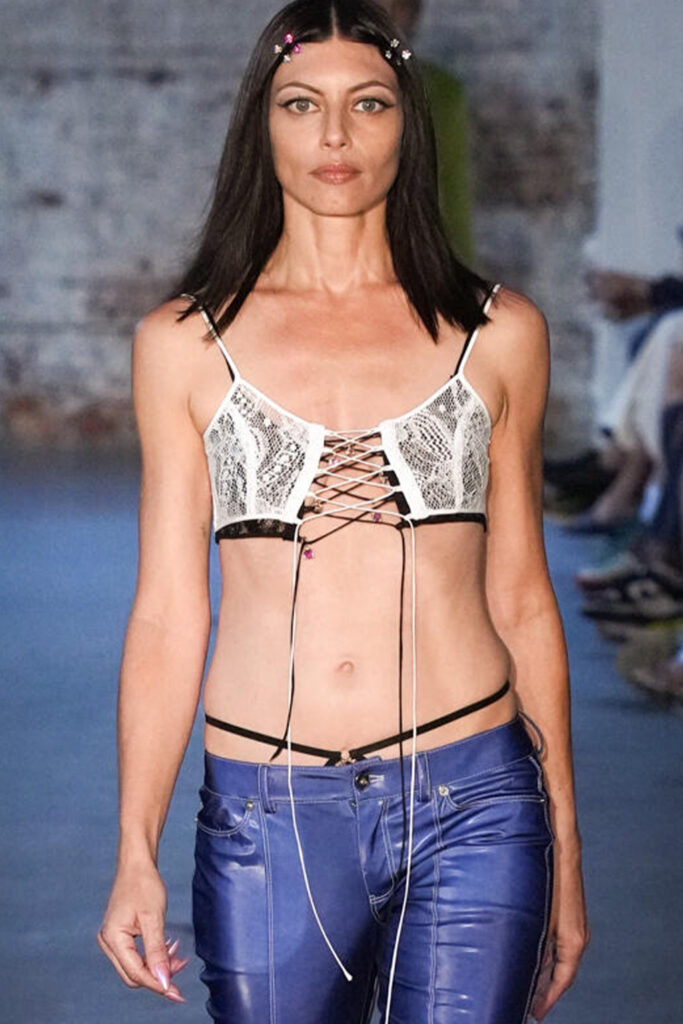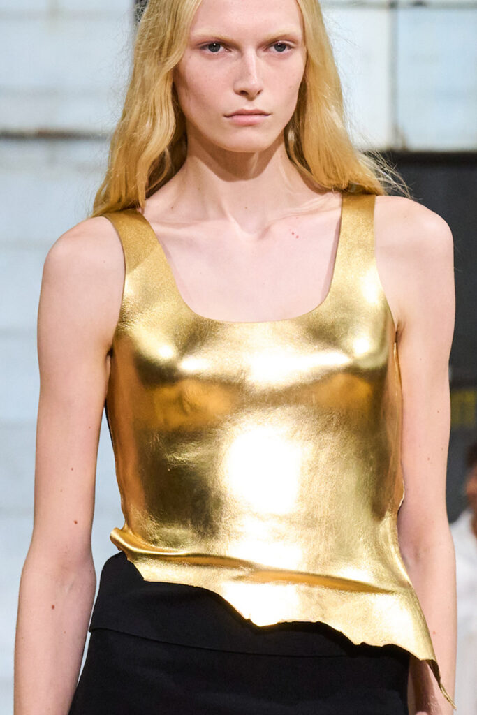 Easy Elegance. SS23 topper is taking advantage of the on-going Y2K influence. From frivolous blouses to cropped silhouettes, halter styles and baby tees the season is showing how the fun Millennium Look can be adjusted to our zeitgeist. Wrapped and Drape elements are key for a sophisticated notion, while cut-outs dare to explore new spaces, from belly to shoulder. The SS23 material and color offer that is focused on featherweights is infusing tops with a lucid effect, almost nude, when we look at the new minimal tank, sheer tops and large number of body-baring bralettes. Despite structured pieces like corsets or hyper-fitted drapes, a gentle padding effect maintains the free and liberating sensation and does not feel restricting. Take a look at the SS23 Bralette Section and the Emerging Fashion Pieces at the end of the report.