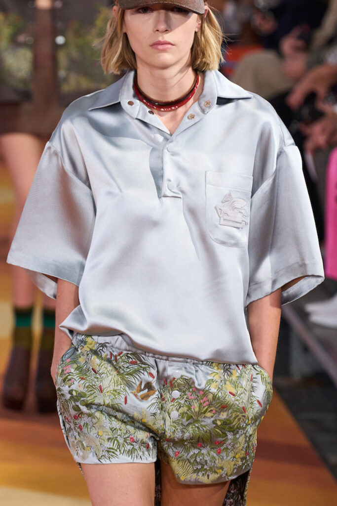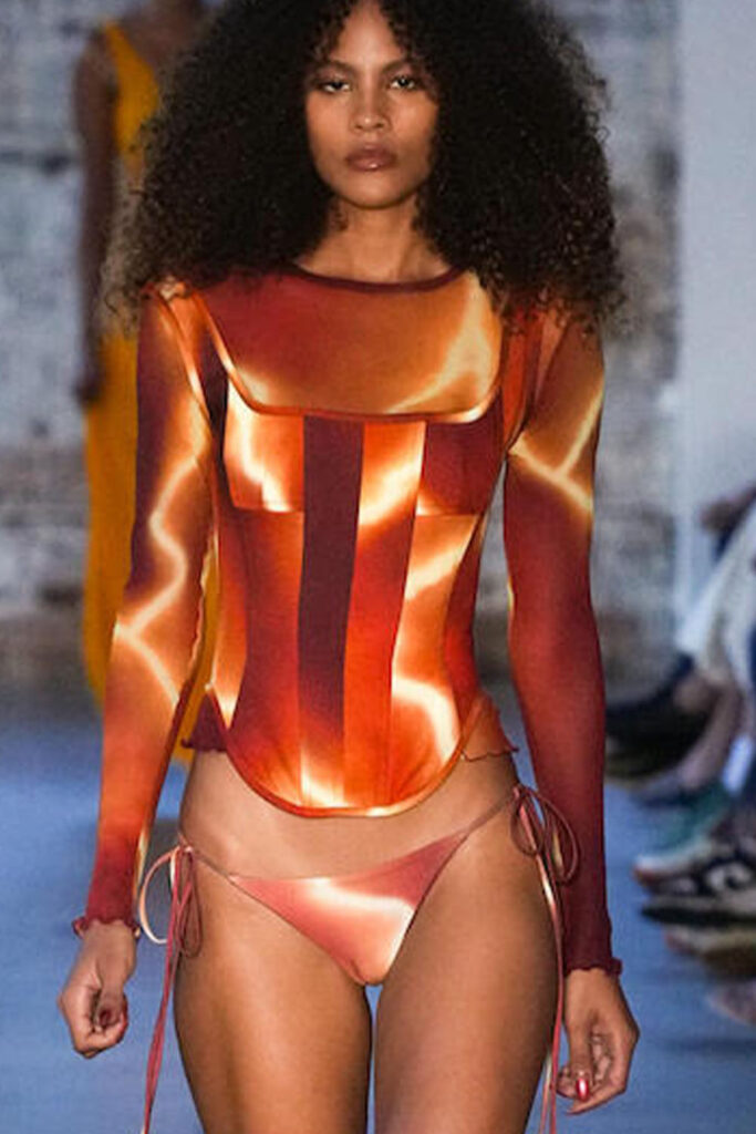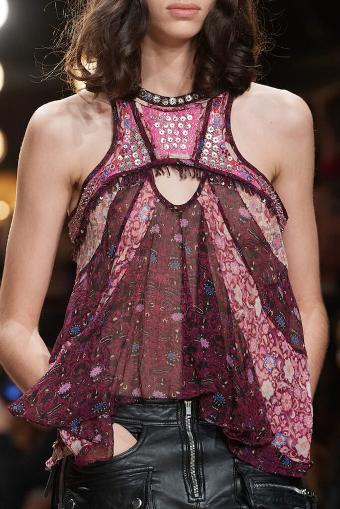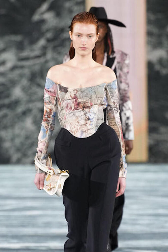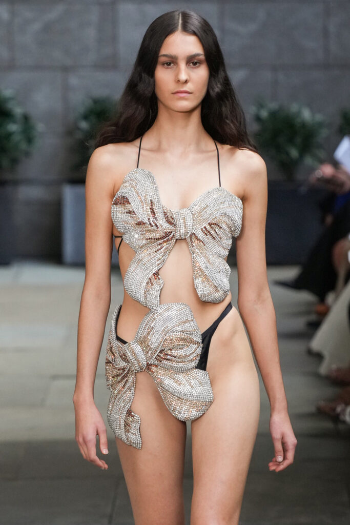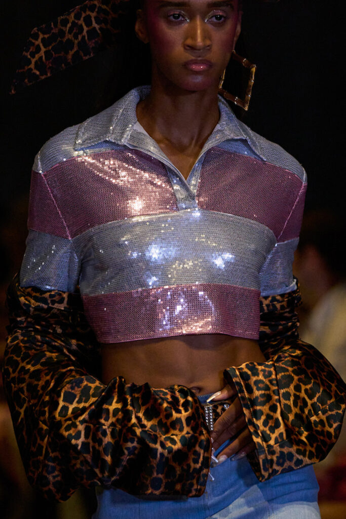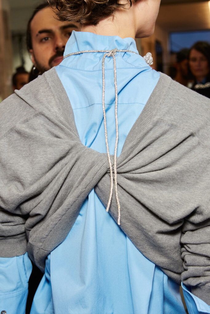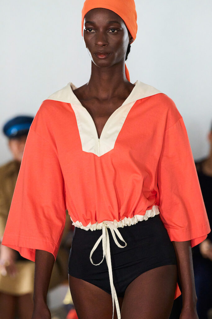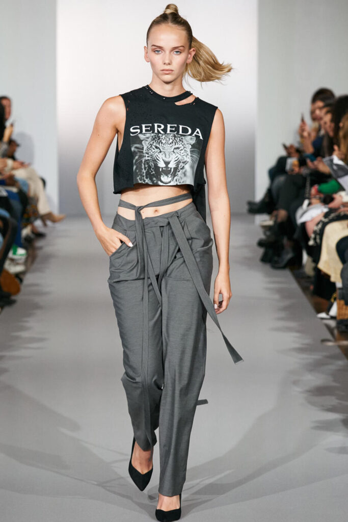 Easy Elegance. SS23 topper is taking advantage of the on-going Y2K influence. From frivolous blouses to cropped silhouettes, halter styles and baby tees the season is showing how the fun Millennium Look can be adjusted to our zeitgeist. Wrapped and Drape elements are key for a sophisticated notion, while cut-outs dare to explore new spaces, from belly to shoulder. The SS23 material and color offer that is focused on featherweights is infusing tops with a lucid effect, almost nude, when we look at the new minimal tank, sheer tops and large number of body-baring bralettes. Despite structured pieces like corsets or hyper-fitted drapes, a gentle padding effect maintains the free and liberating sensation and does not feel restricting. Take a look at the SS23 Bralette Section and the Emerging Fashion Pieces at the end of the report.