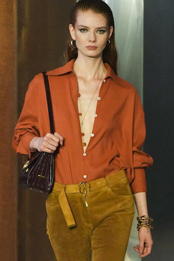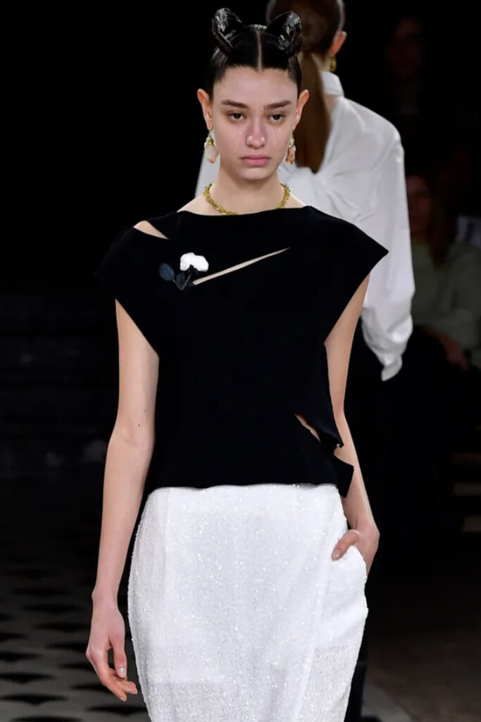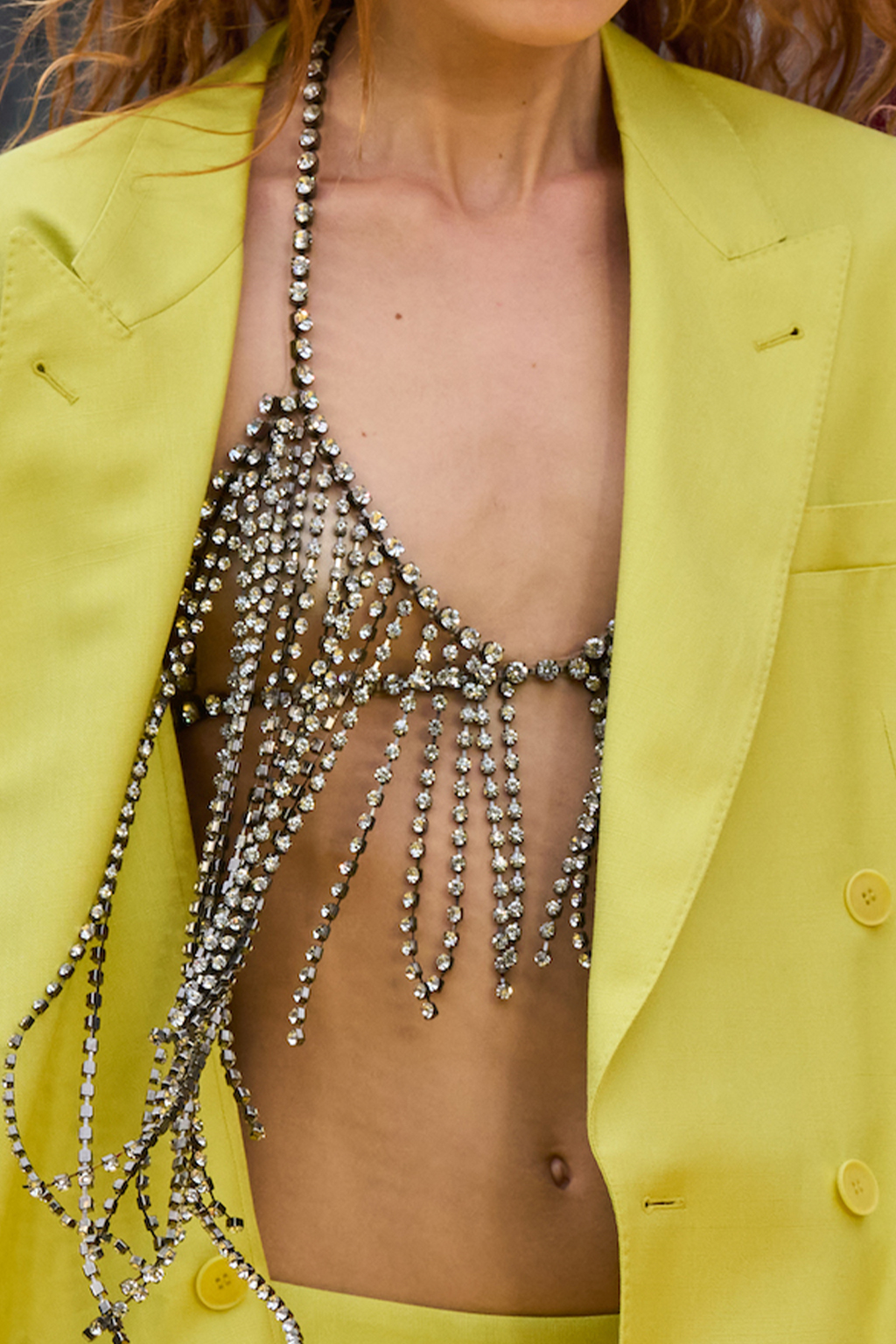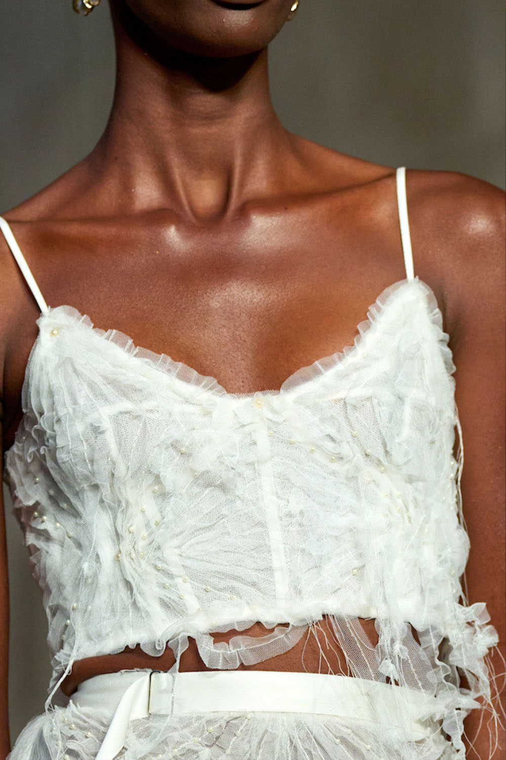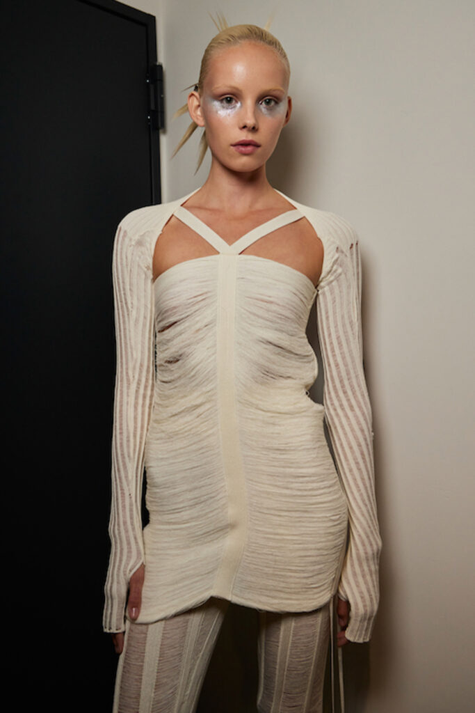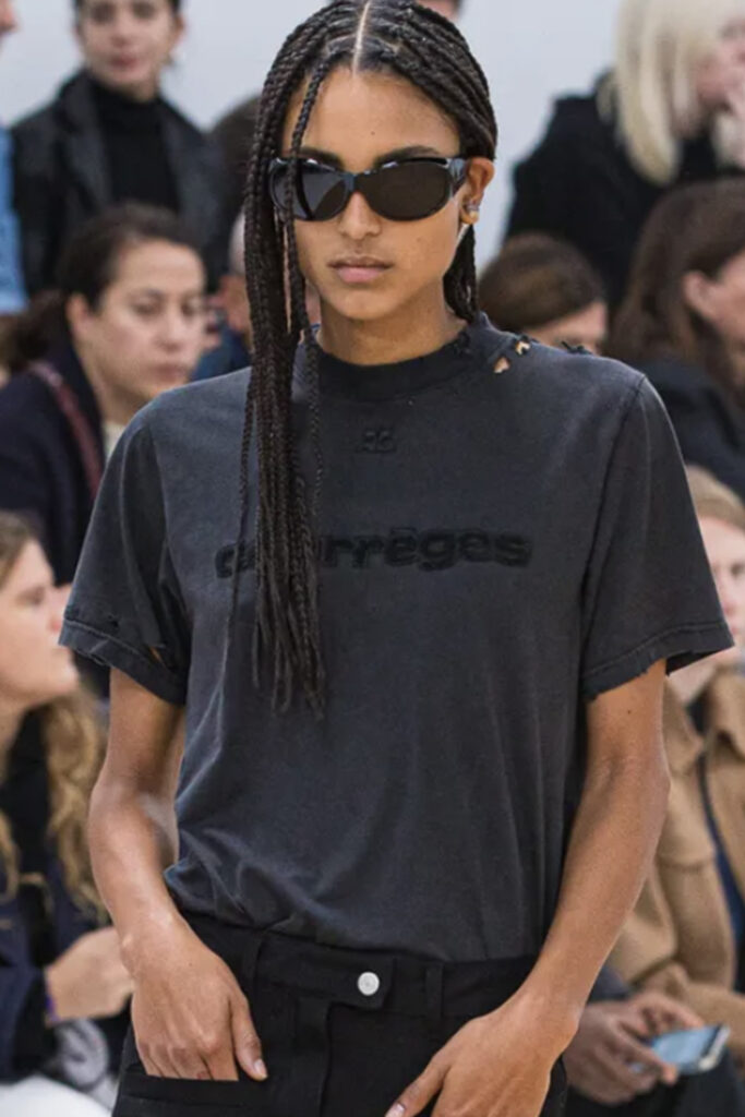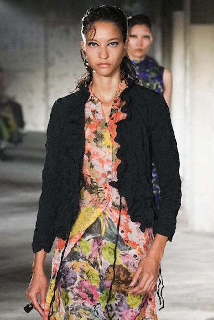 Easy Elegance. SS23 topper is taking advantage of the on-going Y2K influence. From frivolous blouses to cropped silhouettes, halter styles and baby tees the season is showing how the fun Millennium Look can be adjusted to our zeitgeist. Wrapped and Drape elements are key for a sophisticated notion, while cut-outs dare to explore new spaces, from belly to shoulder. The SS23 material and color offer that is focused on featherweights is infusing tops with a lucid effect, almost nude, when we look at the new minimal tank, sheer tops and large number of body-baring bralettes. Despite structured pieces like corsets or hyper-fitted drapes, a gentle padding effect maintains the free and liberating sensation and does not feel restricting. Take a look at the SS23 Bralette Section and the Emerging Fashion Pieces at the end of the report.