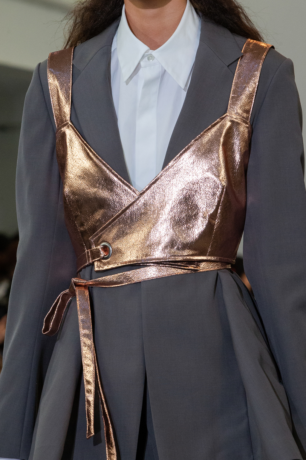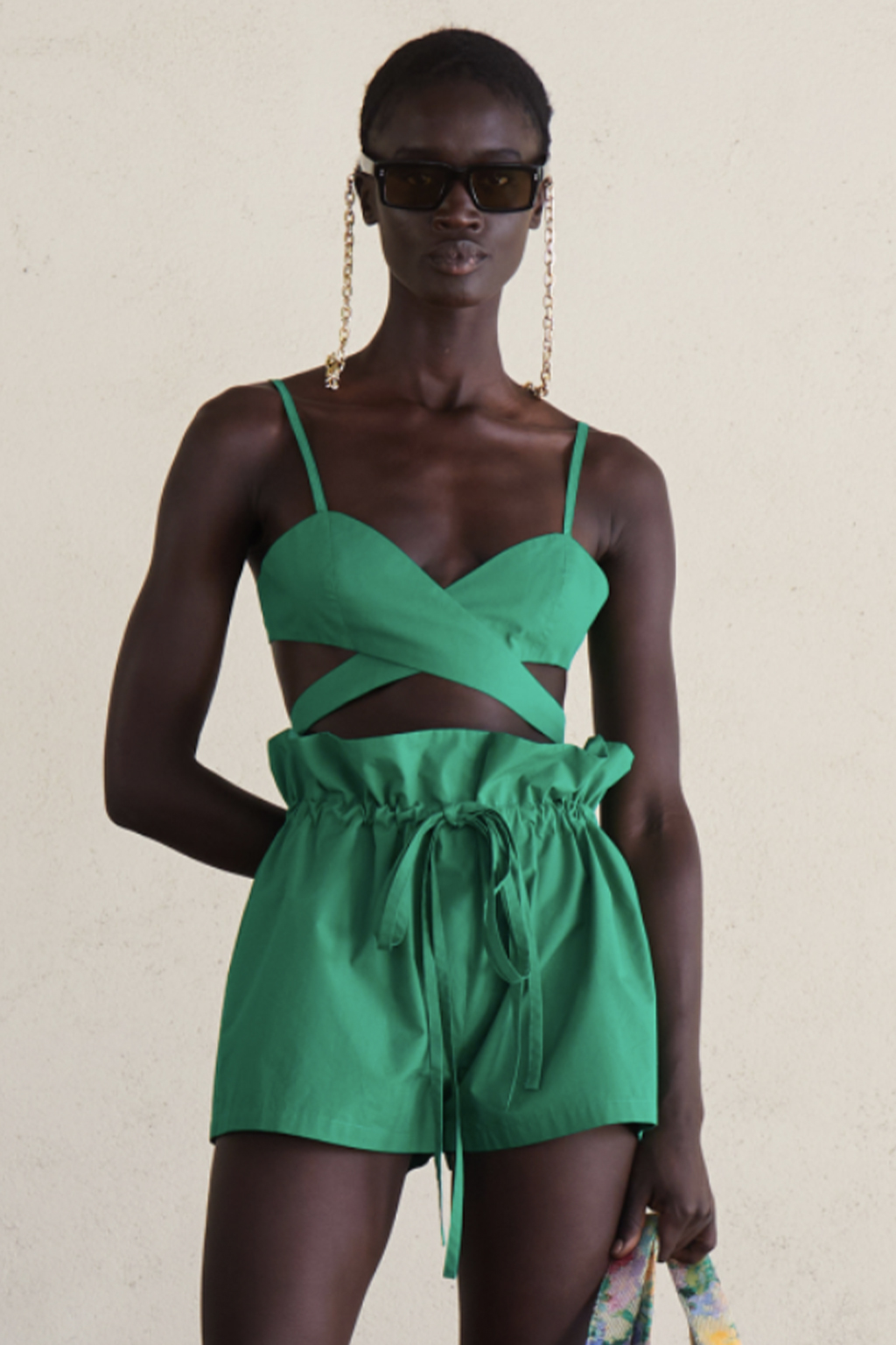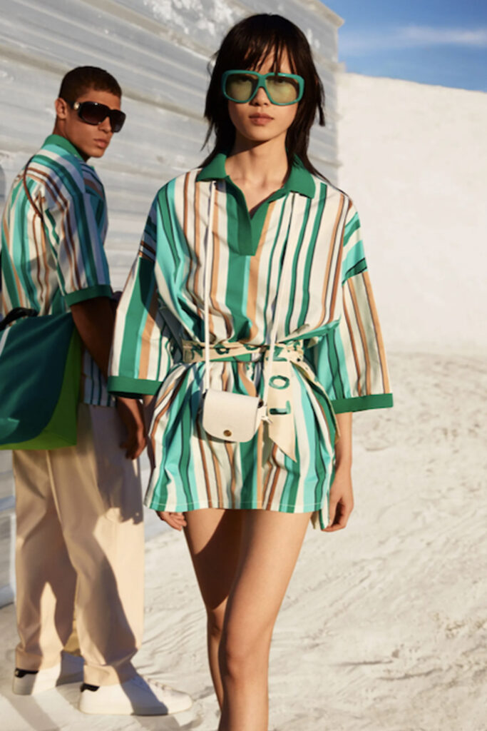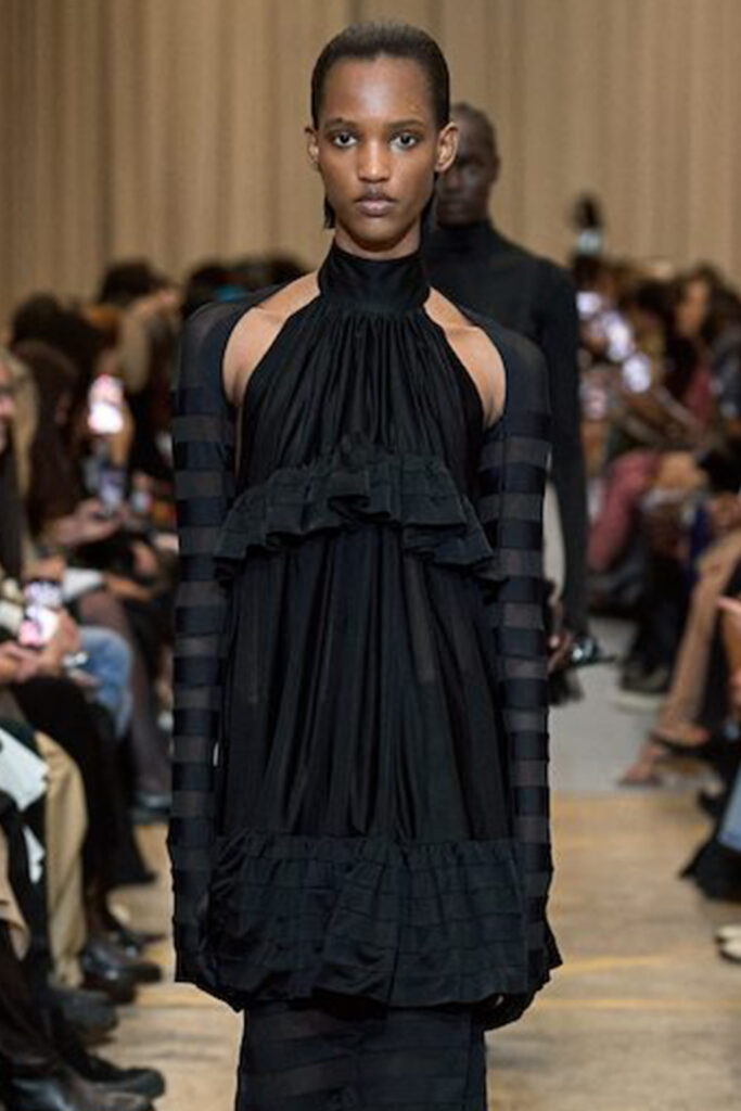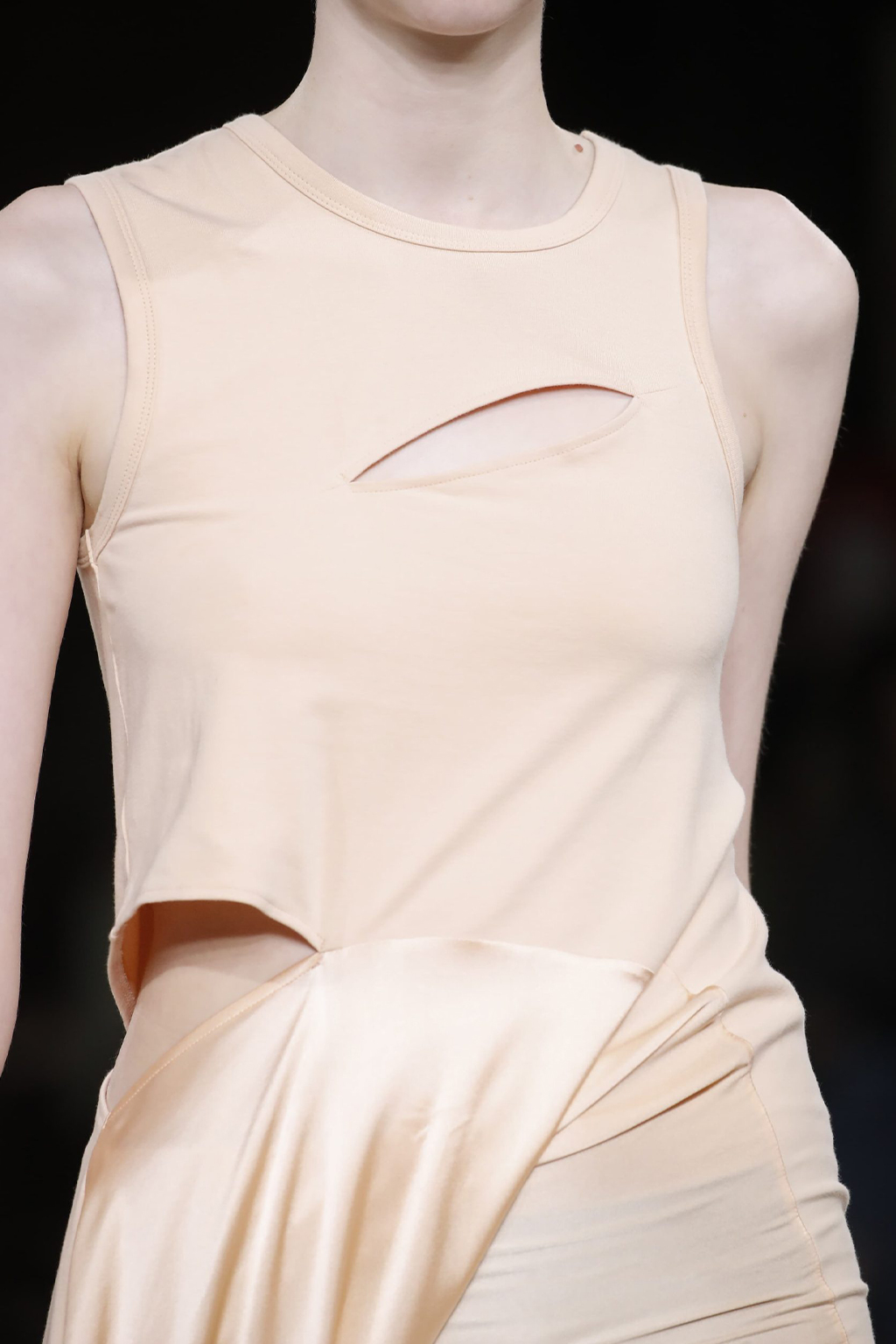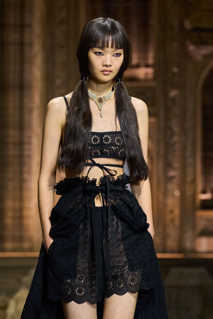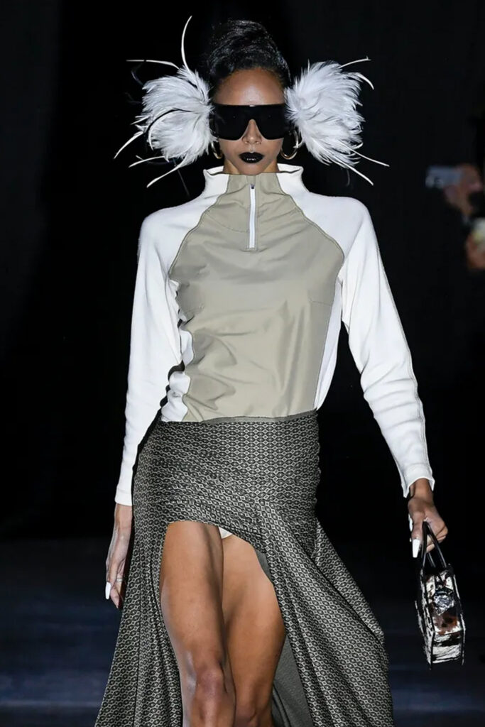 Easy Elegance. SS23 topper is taking advantage of the on-going Y2K influence. From frivolous blouses to cropped silhouettes, halter styles and baby tees the season is showing how the fun Millennium Look can be adjusted to our zeitgeist. Wrapped and Drape elements are key for a sophisticated notion, while cut-outs dare to explore new spaces, from belly to shoulder. The SS23 material and color offer that is focused on featherweights is infusing tops with a lucid effect, almost nude, when we look at the new minimal tank, sheer tops and large number of body-baring bralettes. Despite structured pieces like corsets or hyper-fitted drapes, a gentle padding effect maintains the free and liberating sensation and does not feel restricting. Take a look at the SS23 Bralette Section and the Emerging Fashion Pieces at the end of the report.
