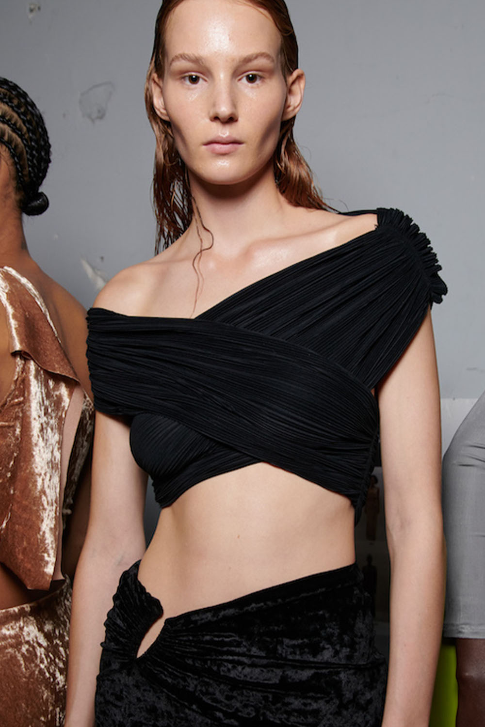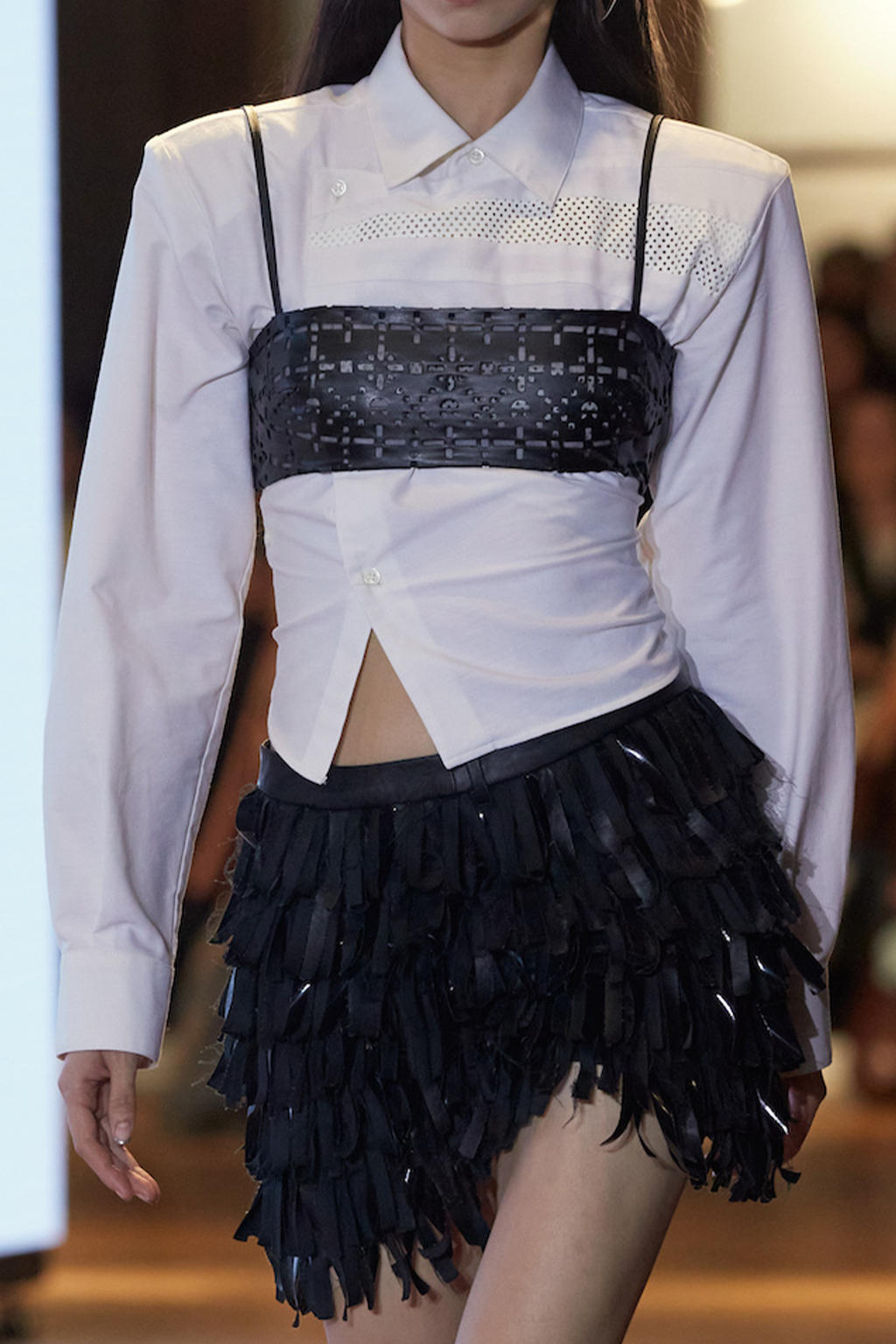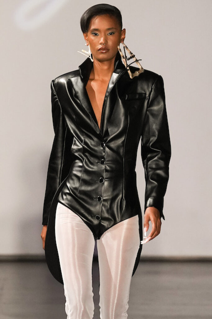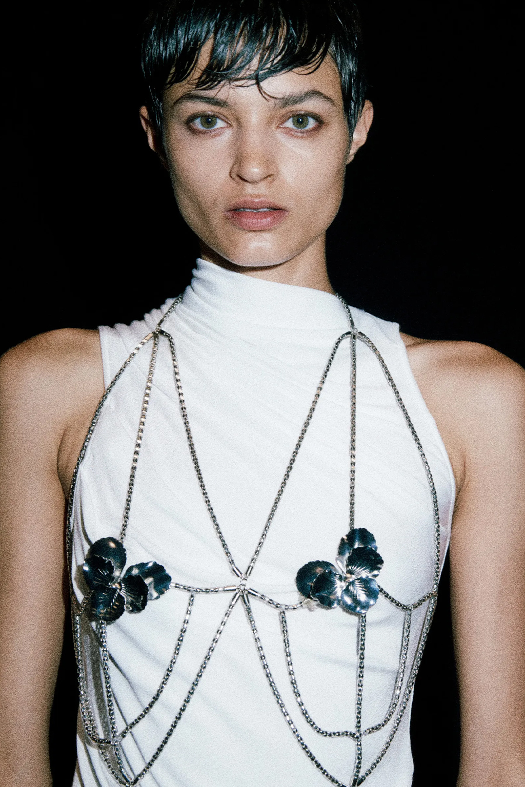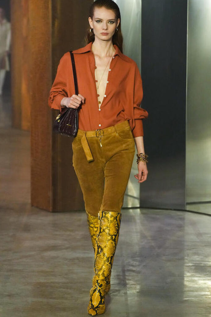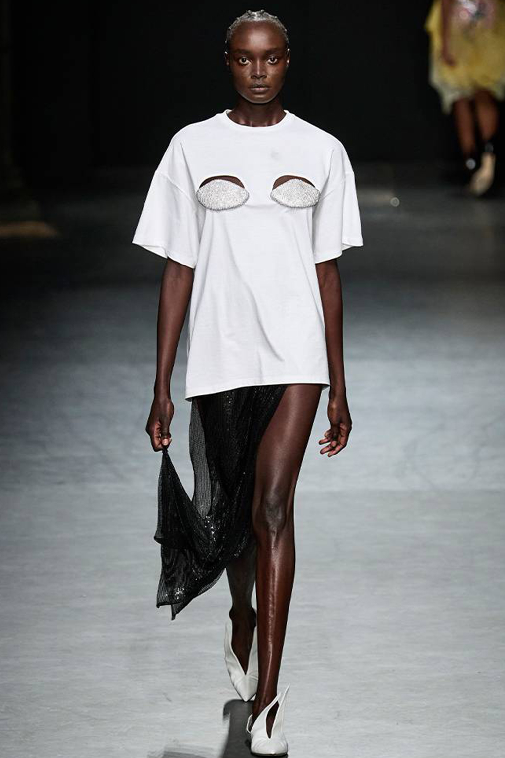 Easy Elegance. SS23 topper is taking advantage of the on-going Y2K influence. From frivolous blouses to cropped silhouettes, halter styles and baby tees the season is showing how the fun Millennium Look can be adjusted to our zeitgeist. Wrapped and Drape elements are key for a sophisticated notion, while cut-outs dare to explore new spaces, from belly to shoulder. The SS23 material and color offer that is focused on featherweights is infusing tops with a lucid effect, almost nude, when we look at the new minimal tank, sheer tops and large number of body-baring bralettes. Despite structured pieces like corsets or hyper-fitted drapes, a gentle padding effect maintains the free and liberating sensation and does not feel restricting. Take a look at the SS23 Bralette Section and the Emerging Fashion Pieces at the end of the report.