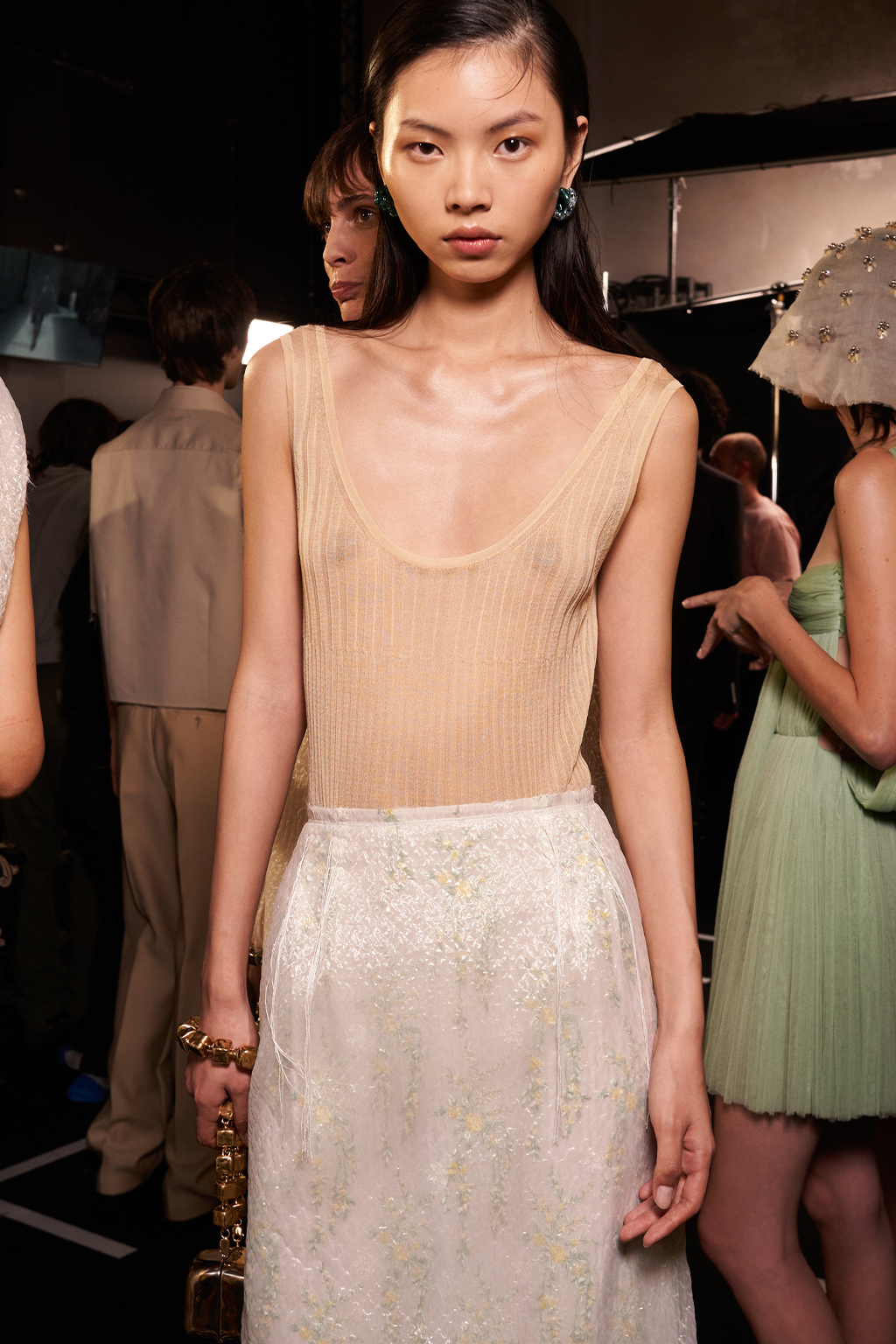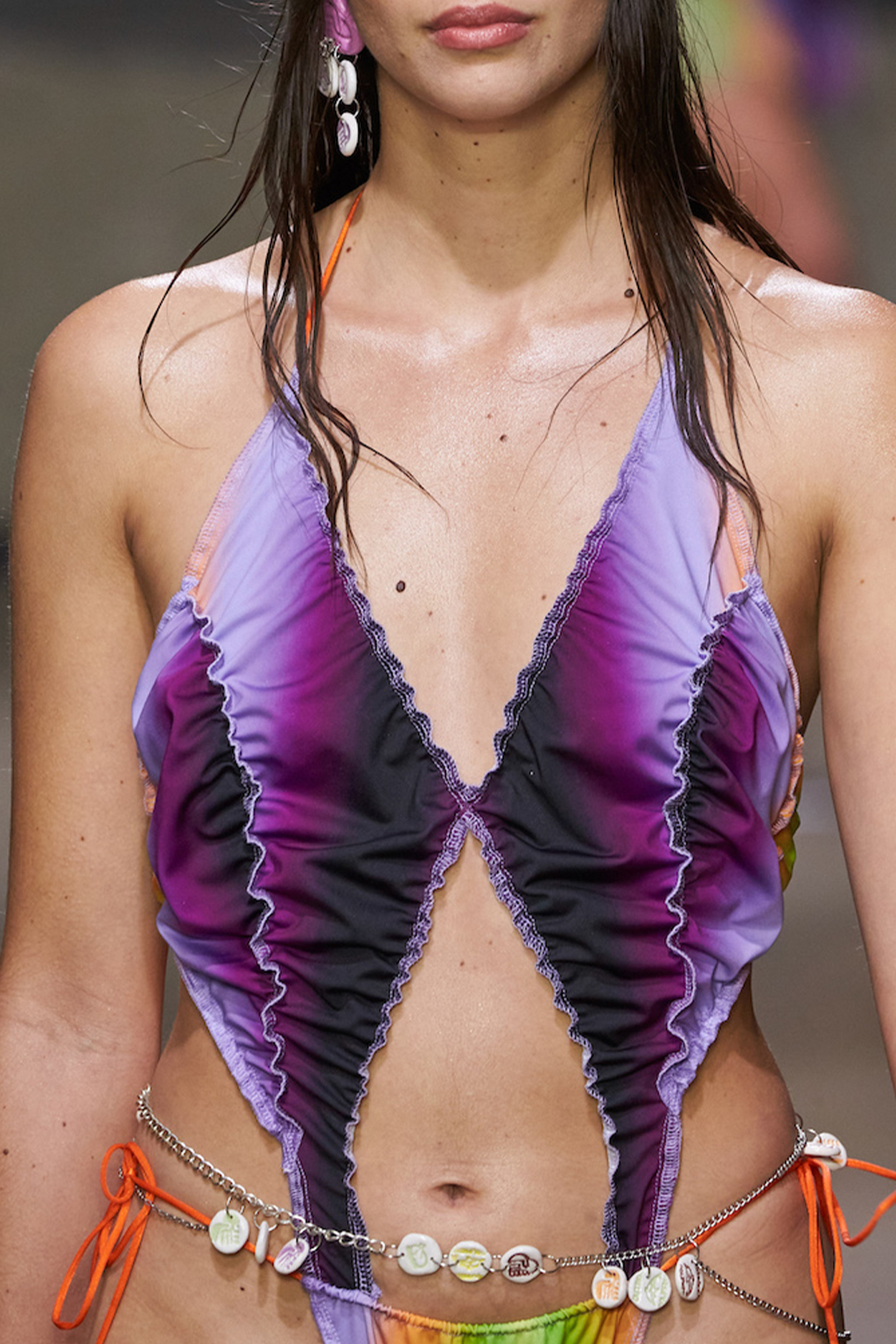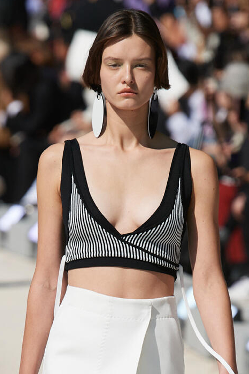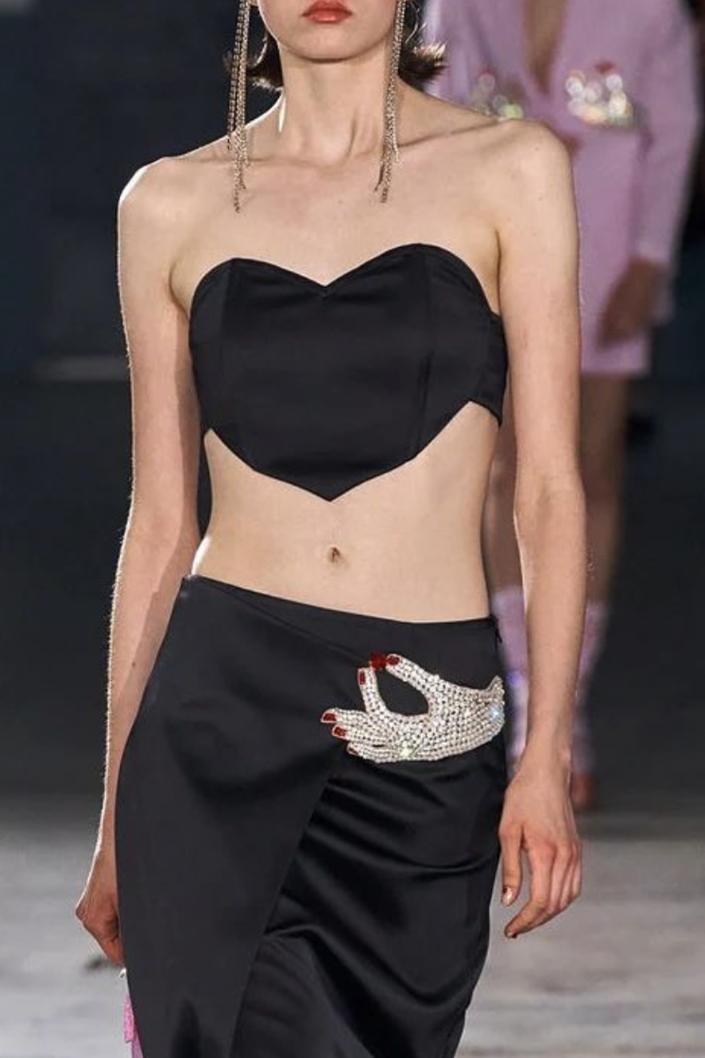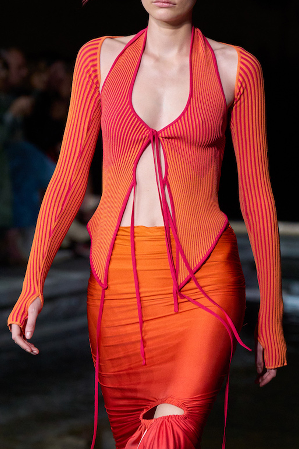 Easy Elegance. SS23 topper is taking advantage of the on-going Y2K influence. From frivolous blouses to cropped silhouettes, halter styles and baby tees the season is showing how the fun Millennium Look can be adjusted to our zeitgeist. Wrapped and Drape elements are key for a sophisticated notion, while cut-outs dare to explore new spaces, from belly to shoulder. The SS23 material and color offer that is focused on featherweights is infusing tops with a lucid effect, almost nude, when we look at the new minimal tank, sheer tops and large number of body-baring bralettes. Despite structured pieces like corsets or hyper-fitted drapes, a gentle padding effect maintains the free and liberating sensation and does not feel restricting. Take a look at the SS23 Bralette Section and the Emerging Fashion Pieces at the end of the report.