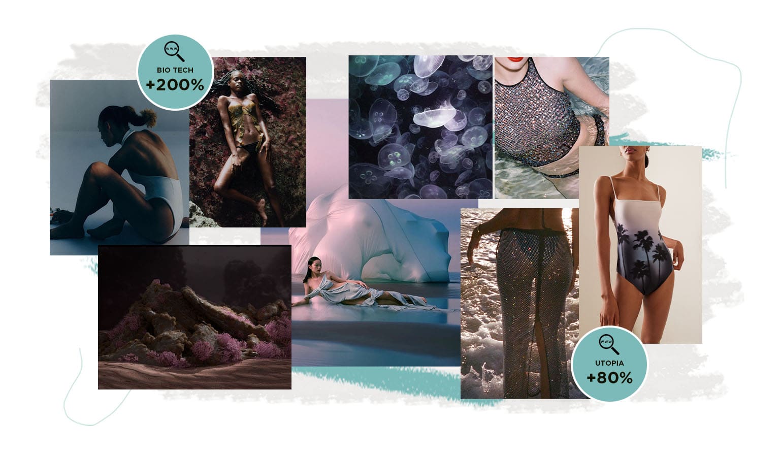 Otherworldly Shore. Step into the enchanting realm of the Otherworldly Shore, where swimwear transcends its aquatic origins and seamlessly transforms into party wear. This magical concept unfolds in a phantasmagoric display of otherworldly sparkles and gradients, creating a celestial aura that’s perfect for both day and night. The color harmony is a nocturnal exotic symphony, captivating with mysterious shades that dance in the moonlight. Draped and asymmetric styles add an ethereal touch, as if borrowed from a mermaid’s wardrobe. The allure is enhanced with sparkling details that shimmer and glisten, ensuring that each piece possesses an otherworldly charm. This trend invites wearers to embrace the magic within and unleash their inner fantasy, blurring the lines between swimwear and celestial soirées.