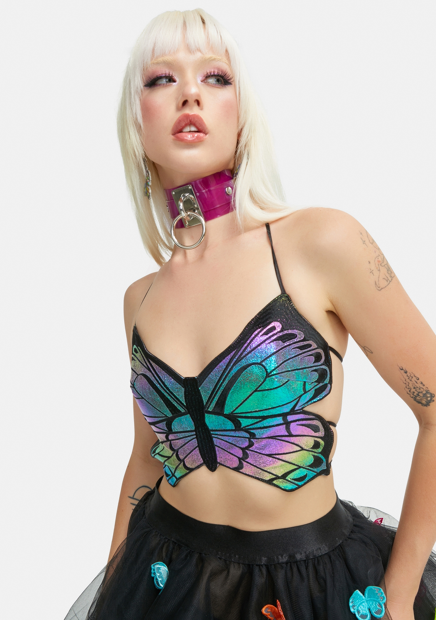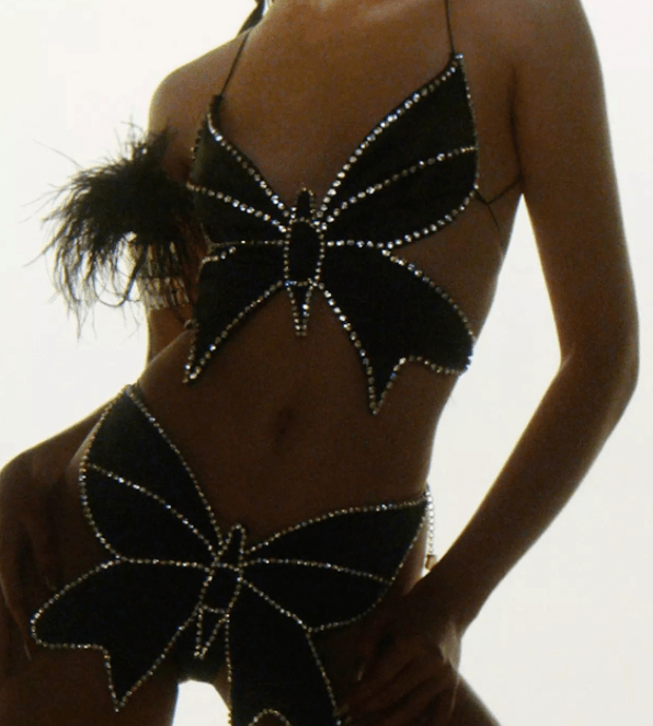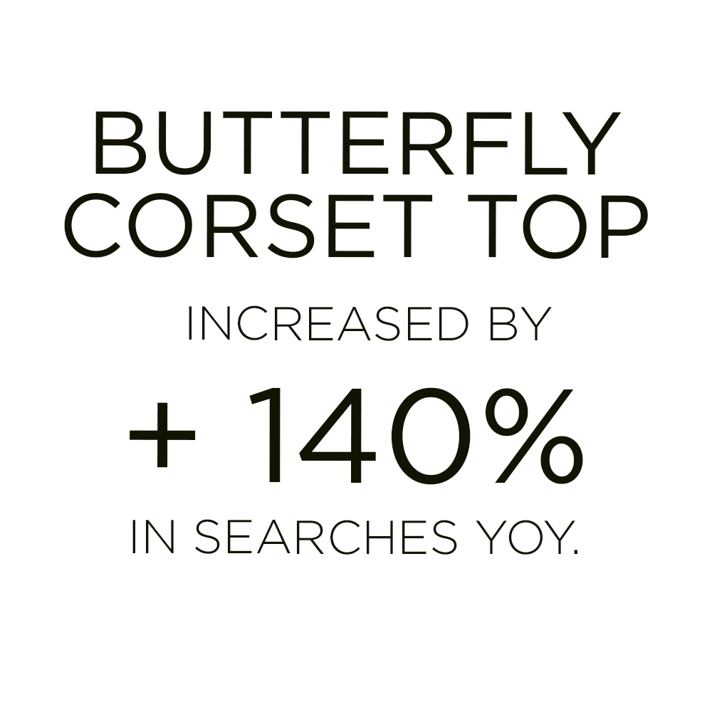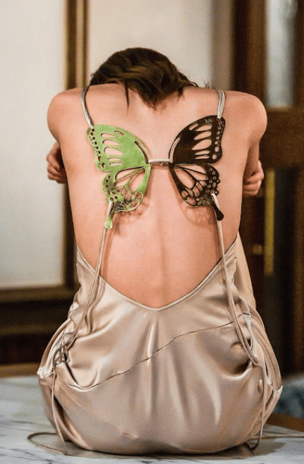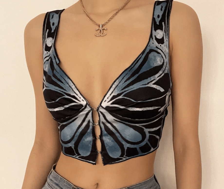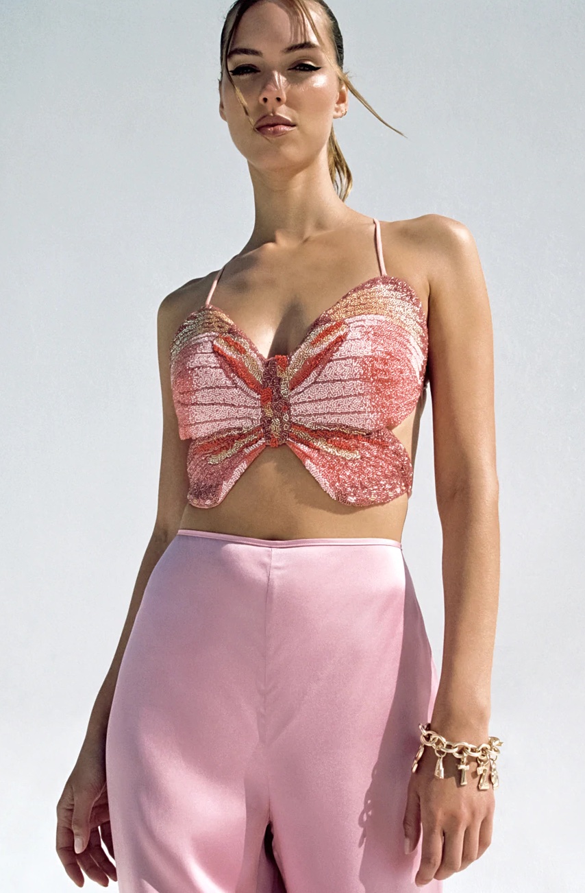 Spring is beginning to tint our days with freshness and light and butterflies are returning from winter as a trending motif on Instagram again. The symbol is indubitably connected with the celebration of the Y2K era, which doesn’t seem to cease. But that’s not the only reason fashion can’t get enough of the new animal trend. For the most fashionable, the motif transforms into a more literal interpretation of butterfly-shaped tops. As butterflies represent adolescence, a moment of transformation where our bodies feel trapped and seek for freedom, this meaningful figure becomes a reminder of that important and liberating passage of our lives. Marking a rebirth, a butterfly is set as metaphor of several crucial themes that society is facing: moving from stillness to new life, rediscovering the self and sending a message of hope. Being creatively re-interpreted into several styles, from preppy corset to daring bra, butterfly tops invite young consumers to express their self with a hymn to life.