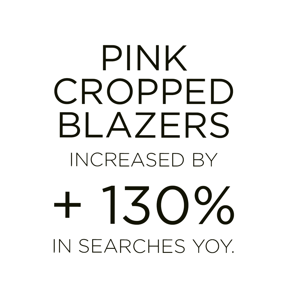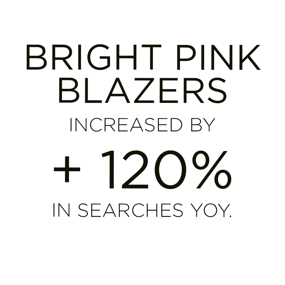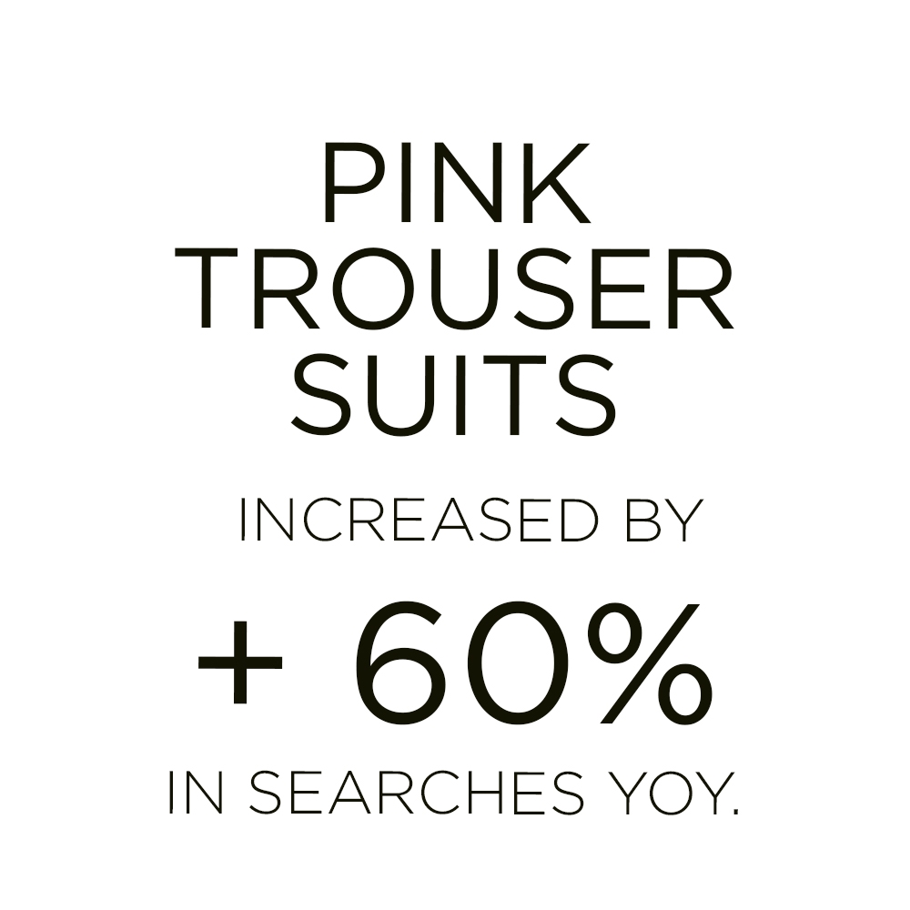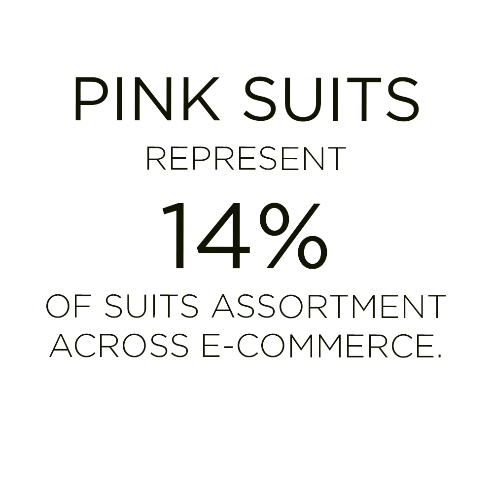 Accounting for 14% of suits across e-commerce, the pink set is leading recent SS22 collection drops. The style has already emerged as a favorite during the past fashion shows and still retains its show-stopping quality on current runway presentations as well. The suit perfectly embraces a new sense of femininity, which builds on the duality of womanhood, of being soft and strong at the same time. The masculine tailoring aspect of the suit, as well as the female notions that are embedded in pink shades fuse into a versatile piece. From dopamine bolds to subtle pastels, the iconic style can fuse into a multitude of narratives.